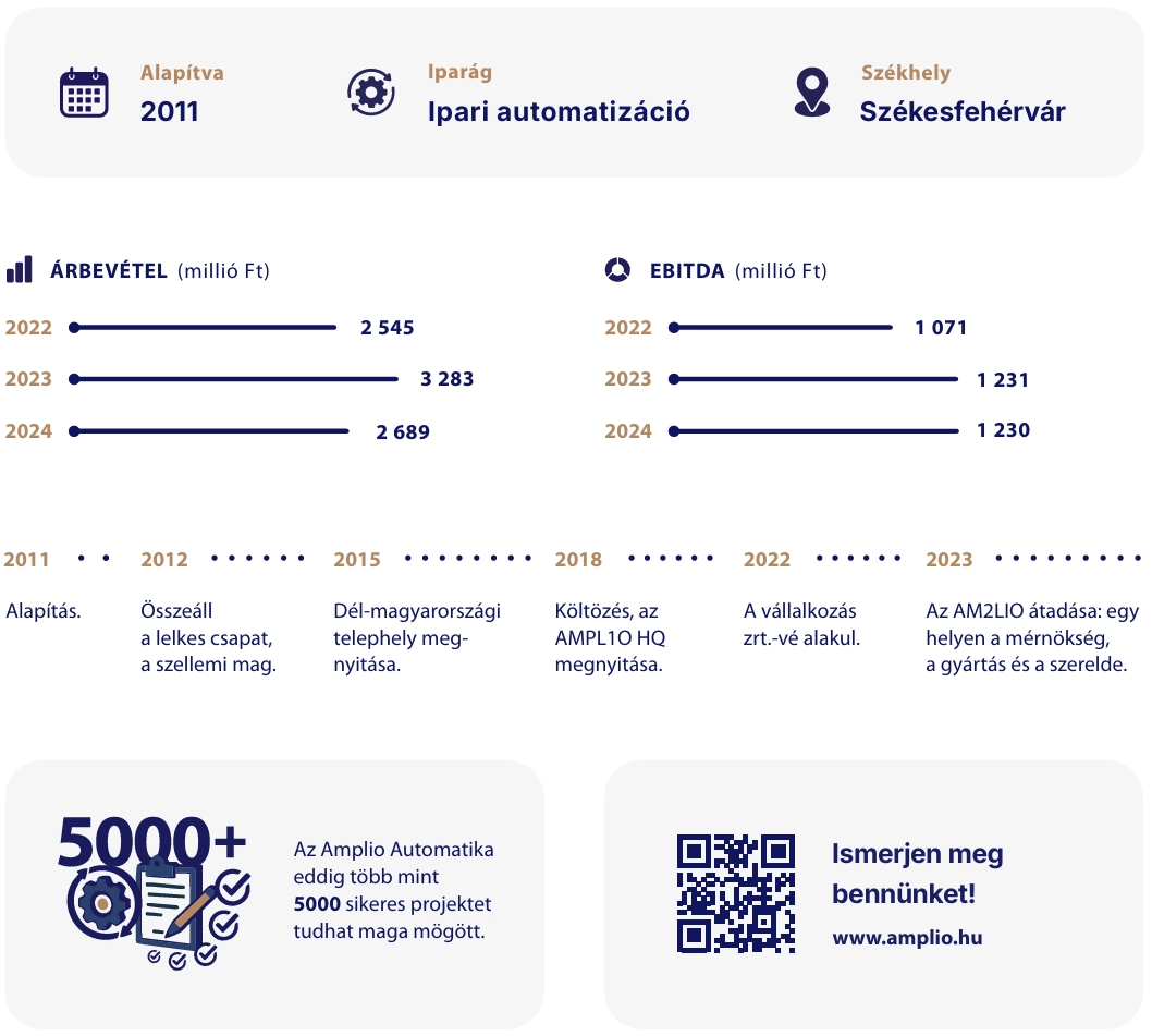 A 2011-ben alapított Amplio Automatika Zrt. a hazai ipar egyik dinamikusan fejlődő szereplője. A vállalat egyedi gyártási és minőségellenőrzési megoldásokat tervez és szállít nemzetközi ügyfelei számára. Portfóliójukban gyártó gépek, automata gyártósorok, gyártáskövető szoftveres megoldások, tesztelő- és ellenőrző berendezések szerepelnek. „Célunk, hogy partnereink termelését megbízható és innovatív megoldásokkal támogassuk, amelyek számukra valódi versenyelőnyt jelentenek” – fogalmaz Papp György vezérigazgató.