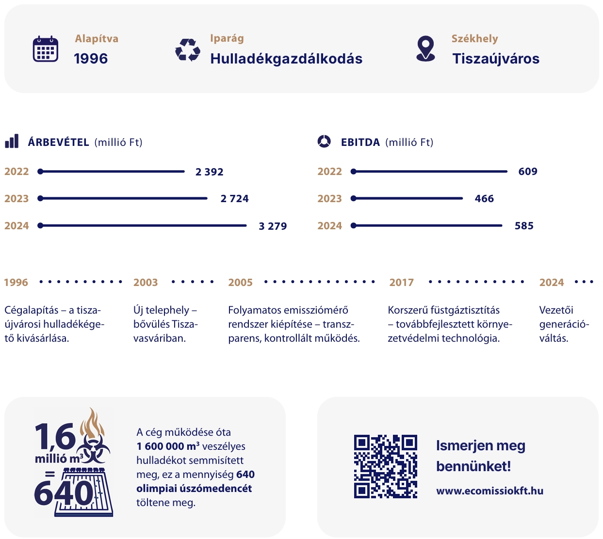 A dinamikusan fejlődő társaság három évtizede van a felelős hulladékkezelés élvonalában, fenntartható, innovatív megoldásokkal formálva a jövőt. Az 1996-ban indult társaság egyre több – ma már évente közel 20 ezer tonna – anyagában újra nem hasznosítható, zömében veszélyes hulladéktól szabadítja meg Magyarországot. Árbevétele a 2024-es üzleti évben 20 százalékos növekedéssel meghaladta a 3,25 milliárd forintot, EBITDA-ja 585 millió forintra, adózott eredménye pedig (több mint 60 százalékkal bővülve) 505 millió forintra nőtt. Mindez külső tőkebevonás nélkül: az Ecomissio ugyanis a kezdetektől fogva lényegében önerőből fejlődik.