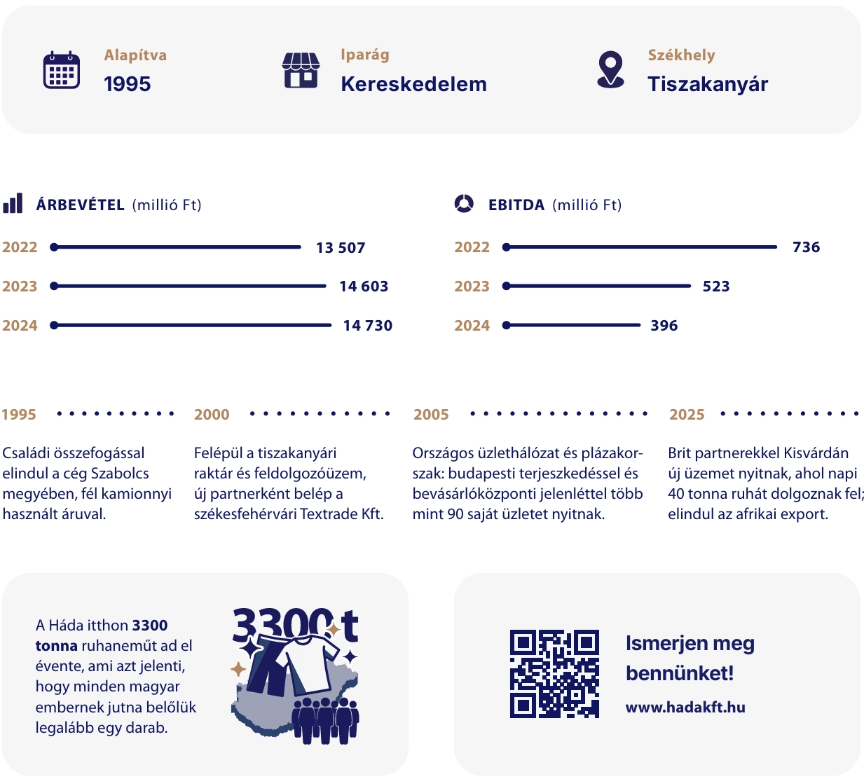 A Háda cégcsoport harminc éve indult a szabolcsi Tiszakanyárról családi vállalkozásként – mára országos hálózattá fejlődött, és kiterjedt nemzetközi kapcsolatrendszere révén Európától Afrikáig hódít új piacokat. Közben pedig „újragombolta” a stílust a használt ruha világában.