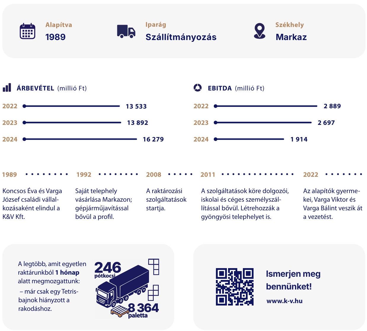 Egy házaspár, Koncsos Éva és Varga József 1989-ben úgy döntöttek, saját kezükbe veszik a jövőjüket. Így született meg a K és V Nemzetközi Fuvarozó Kft., amely ma már több családi vállalkozásnál: néhány évtized alatt a közép-európai régió egyik meghatározó logisztikai szereplőjévé nőtte ki magát.