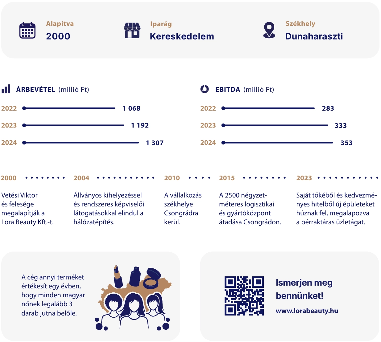 Vetési Viktor, a cég tulajdonos-ügyvezetője korábban egy német–magyar vállalat vezetője volt. Amikor az megszűnt, új vállalkozást alapított, kapcsolataira és tapasztalataira építve indította el a Lora Beauty Kft.-t. „A piac megvolt, az áru nem. Először Kínából szereztem be mindent, s hamar kiderült, hogy ez működik” – emlékszik vissza. A cég hajdíszekkel indult, ma már több mint kétezer terméket forgalmaz, köztük szempillaspirált, alapozót és lakásillatosítót.