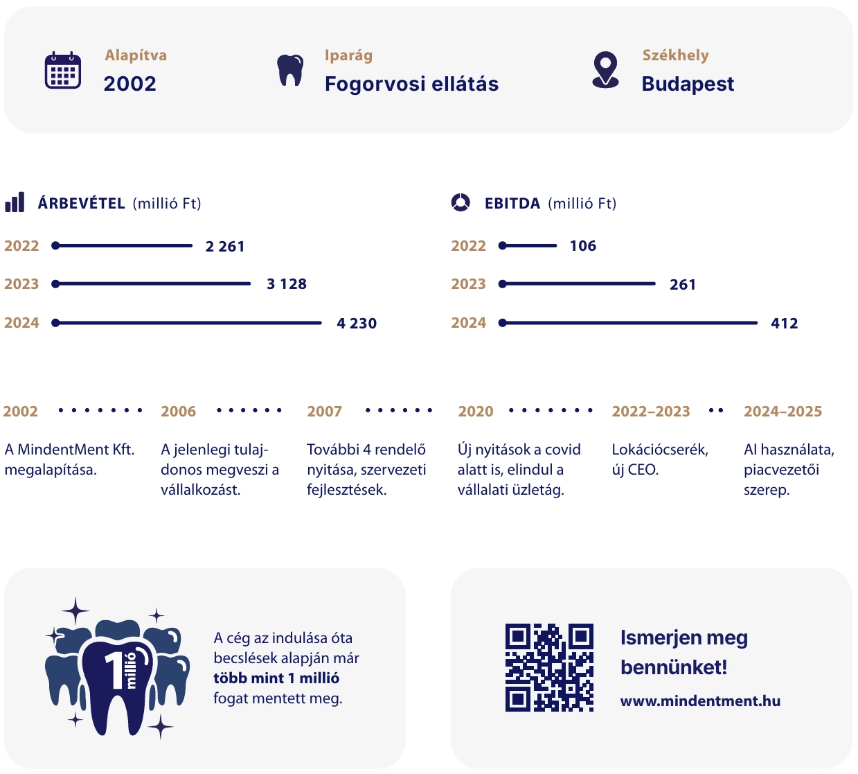 A történet 2002-ben indult, a jelenlegi tulajdonos pedig 2006-ban vette át a céget, egy három kezelővel rendelkező rendelővel. A vásárlás fordulópontot jelentett, innen kezdődött az a fejlődési pálya, amely a MindentMent hálózatot a hazai fogászati szektor meghatározó szereplőjévé emelte.
