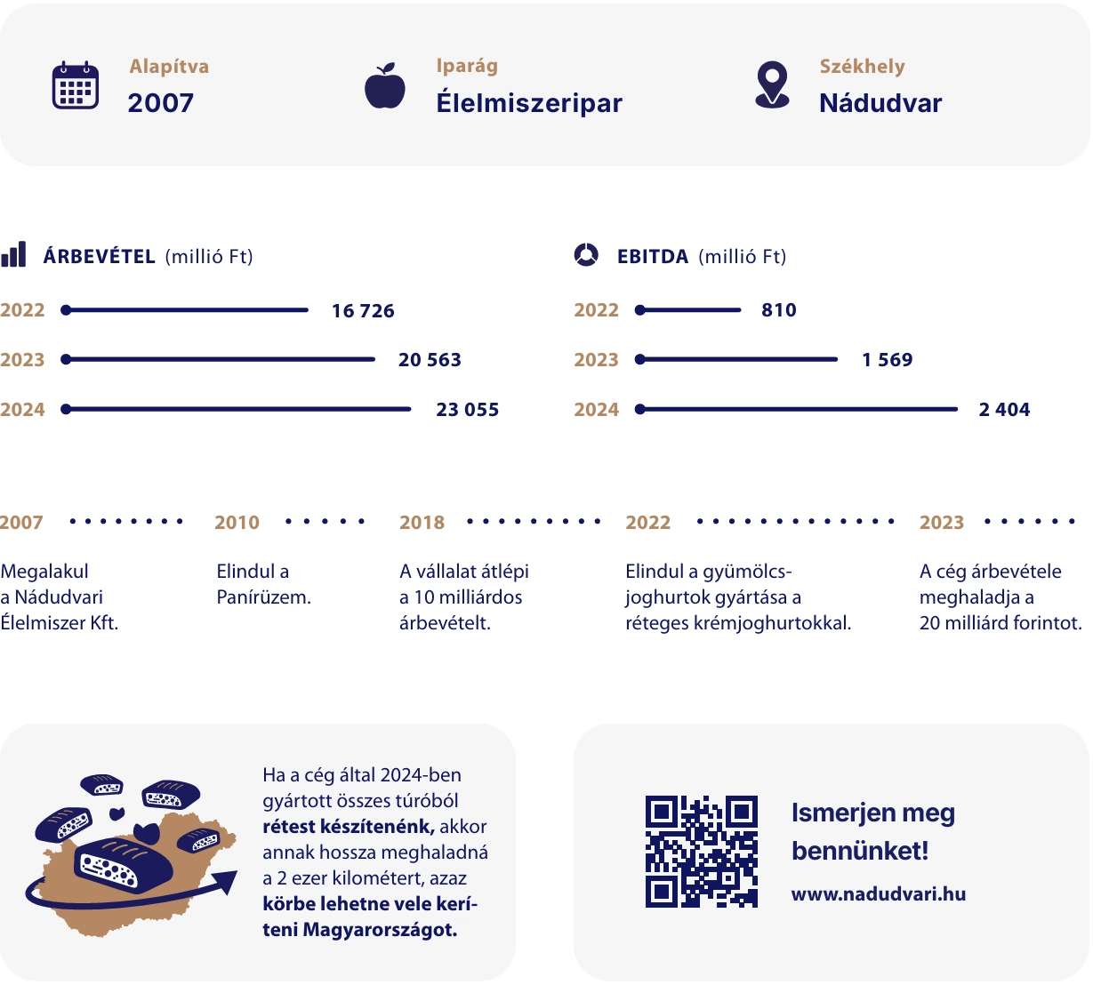 A Nádudvari Élelmiszer Kft. 2024-ben minden korábbinál sikeresebb évet zárt: bevételük meghaladta a 23 milliárd forintot, az utolsó négy évben pedig forgalmuk közel megduplázódott. A növekedés mögött nem pusztán az értékesítés bővülése áll, hanem a hatékonyságnövelés és a tudatos piacépítés is. A fejlesztések a hazai kereslet kielégítése mellett az export-piacok erősítését is célozzák, különösen a fagyasztott termékek területén.
