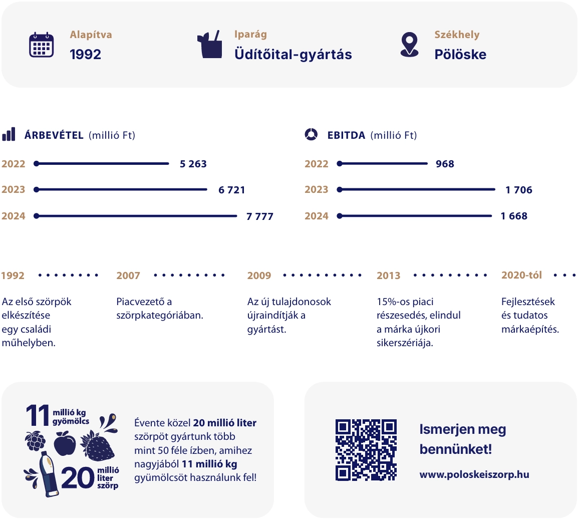 Kevés hazai márka tudhat maga mögött olyan látványos újrakezdést, mint a Pölöskei Szörp. Története 1992-ben, egy szerény vidéki műhelyből indult a Zala megyei Pölöskéről – innen ered a márkanév is. Azóta országos ismertségre tett szert, és tudatosan építi nemzetközi jelenlétét.