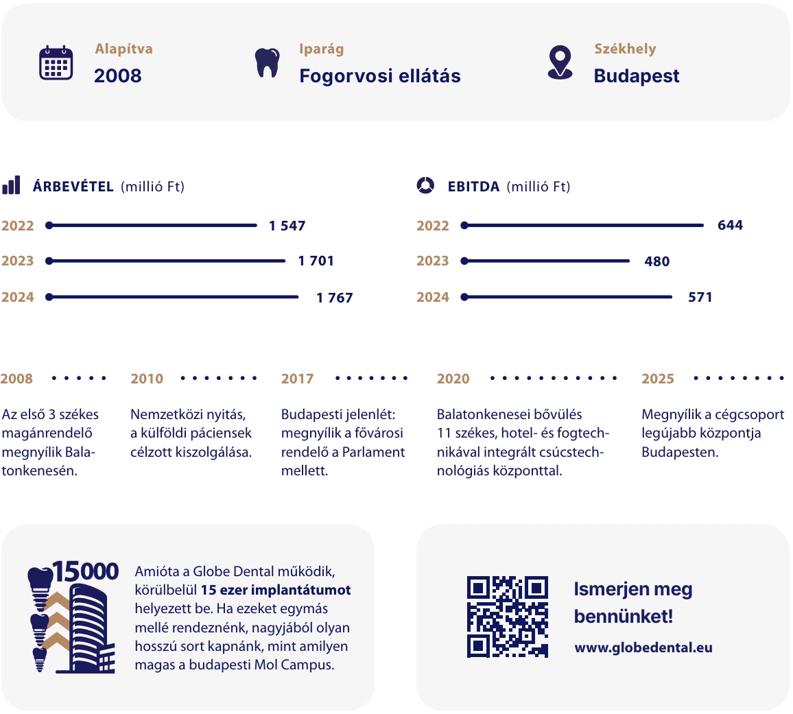 A 2008-ban alapított cég zászlóshajója a balatonkenesei Globe Dental: korszerű fogászati és implantológiai központ saját hotellel, házon belüli fogtechnikával, többnyelvű csapattal – és egyedülálló aneszteziológiai háttérrel, amely garantálja a teljes fájdalommentességet. A növekedést sokáig önerőből finanszírozták, majd pályázatokkal és kedvezményes hitelekkel bővültek.