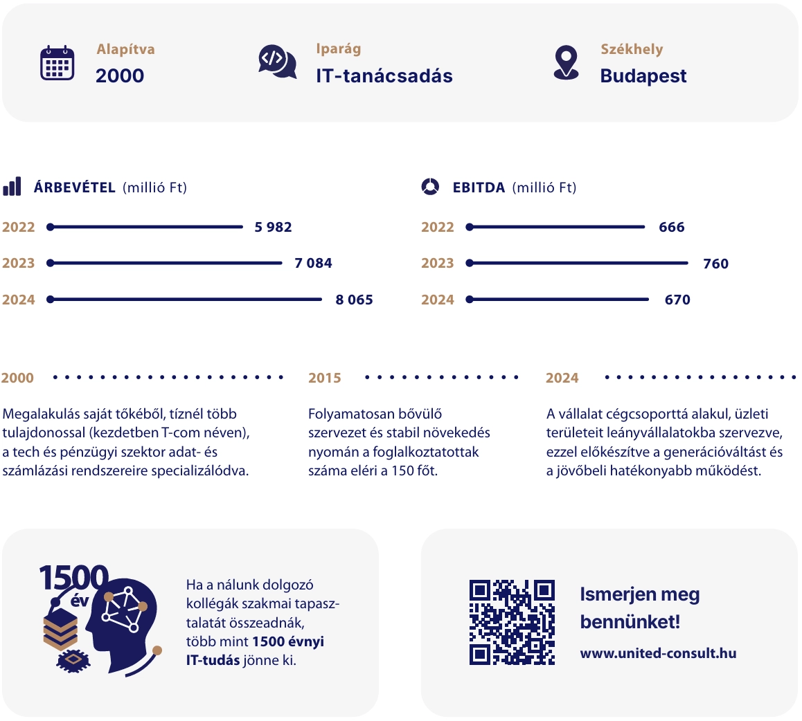 Huszonévesen, külső tőke nélkül indultak – friss tudással, a techszektor lendületével. Csak azt tudták, hogy értenek a technológiához, és jobban akarják csinálni, mint mások. Így lett a United Consult Zrt. Magyarország egyik vezető IT-cége: 25 év alatt 350 fős, közel 9 milliárdos árbevételű cégcsoporttá nőtt, amelyet ma is az alapító csapat magja irányít.