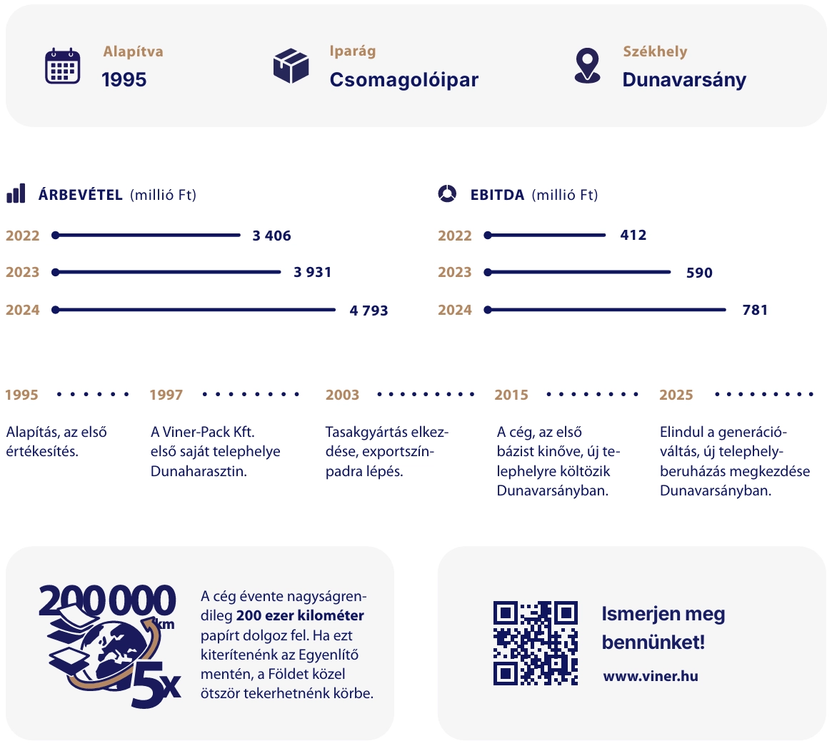 „Nem azt kell néznem, mit csinálunk, hanem azt, hogyan csináljuk.” Ez a gondolat nemcsak Vincze Norbert személyes hitvallása, hanem a Viner-Pack Kft. megújulásának vezérelve is. A közel harmincéves, csaknem 5 milliárd forintos árbevételű családi vállalkozás a hazai papíralapú csomagolóanyag-gyártás egyik meghatározó szereplője. Dinamikus működésének és fenntartható szemléletének köszönhetően ma már az európai élvonalban is jelen van.