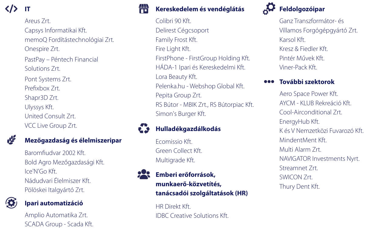 A cégek számát tekintve az idei kiadvány két legnagyobb szektora az IT (11), illetve a kereskedelem és vendéglátás (11), amelyek a vállalatok számának 44 százalékát adják. A „további” (tehát összevontan tárgyalt) kategóriában számos szektor képviselteti magát. Ezek között 1-1 cég jön az energetika, a szállítmányozás, klímatelepítés és karbantartás, légijárművek javítása, szabadidő, sport, biztonságtechnika, magántőkealap, valamint az audio- és videotechnika területéről, míg a fogorvosi ellátást 2 szereplő fémjelzi.